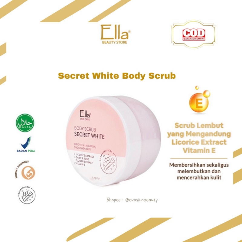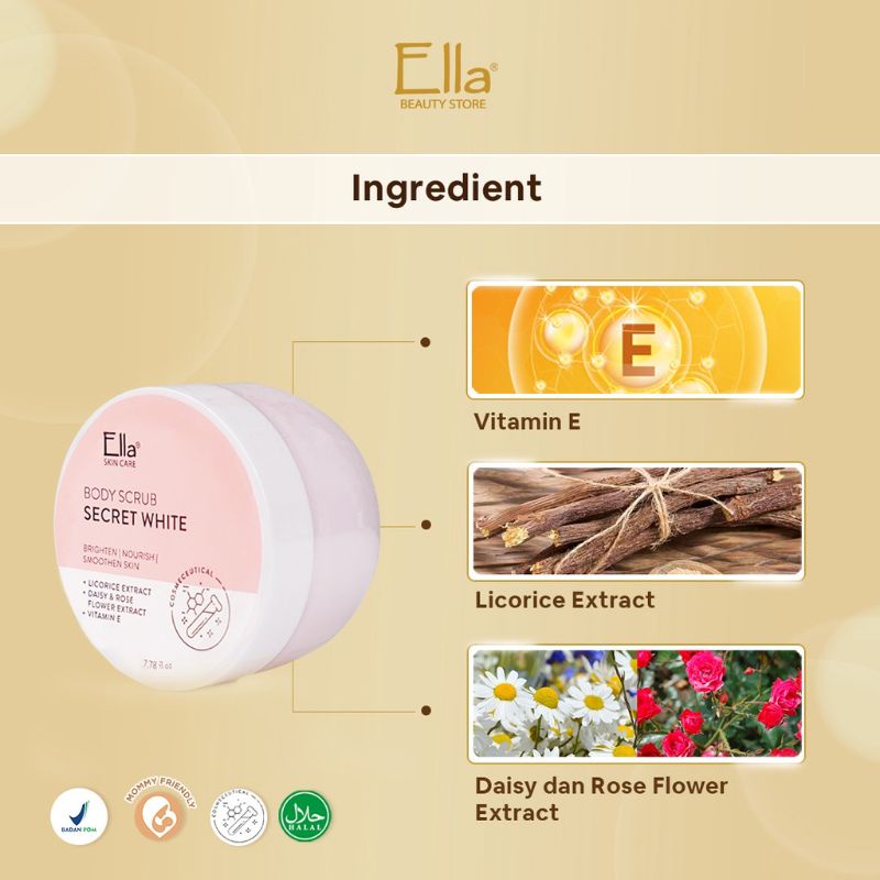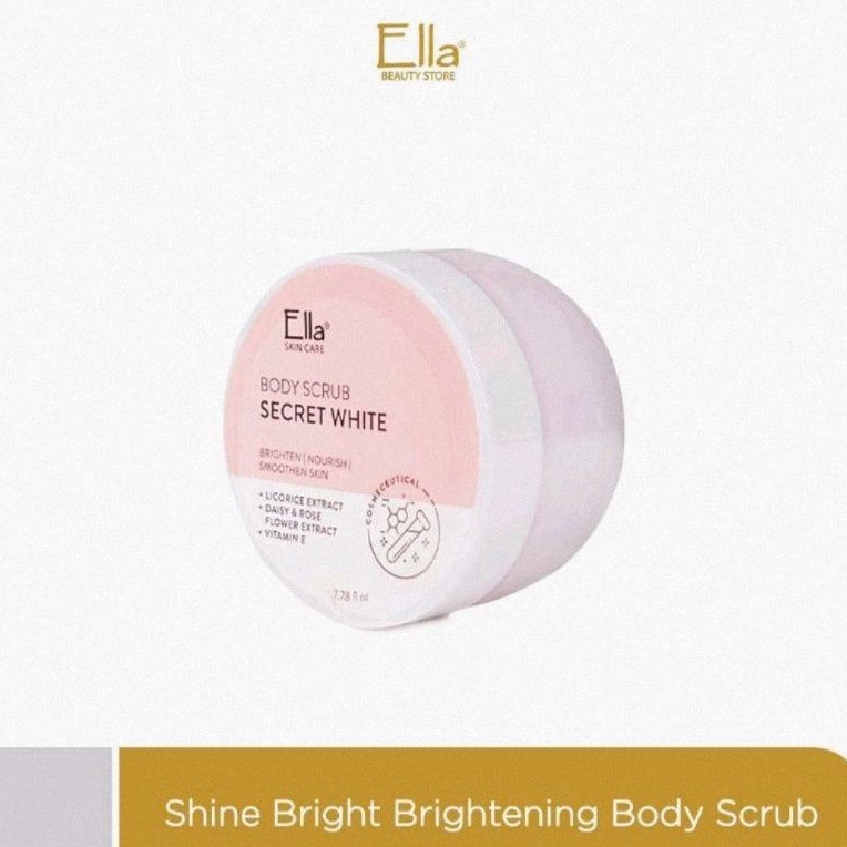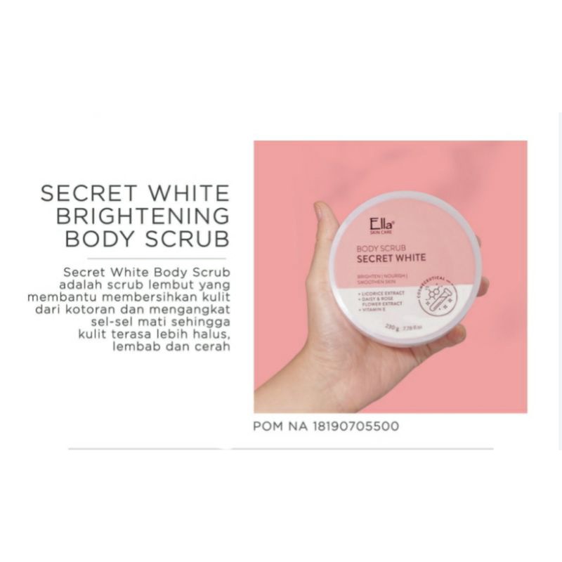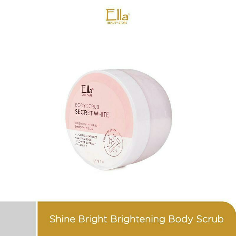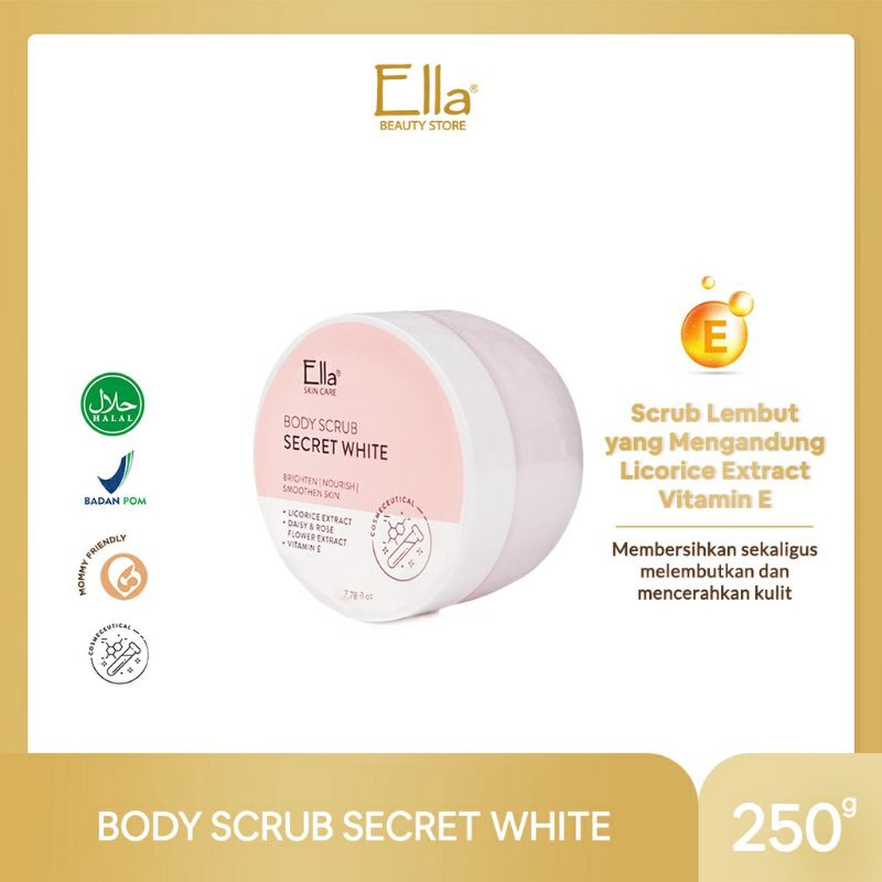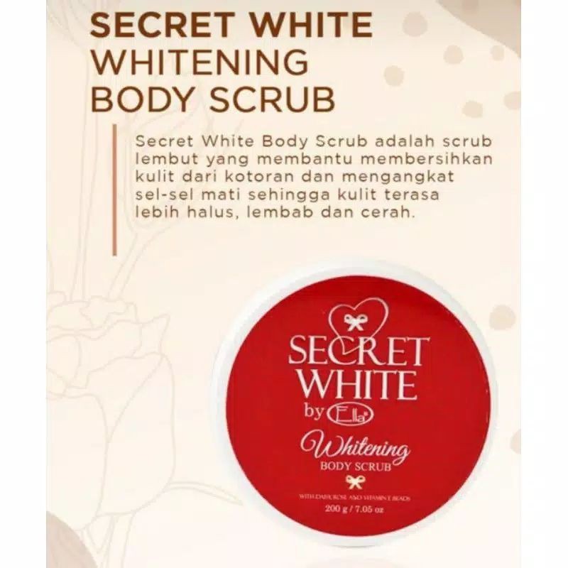 - Ella Skincare Whitening Body Scrub Secret White with Licorice Extract & Olive Oil – Kulit Lembut, Halus, dan Cerah